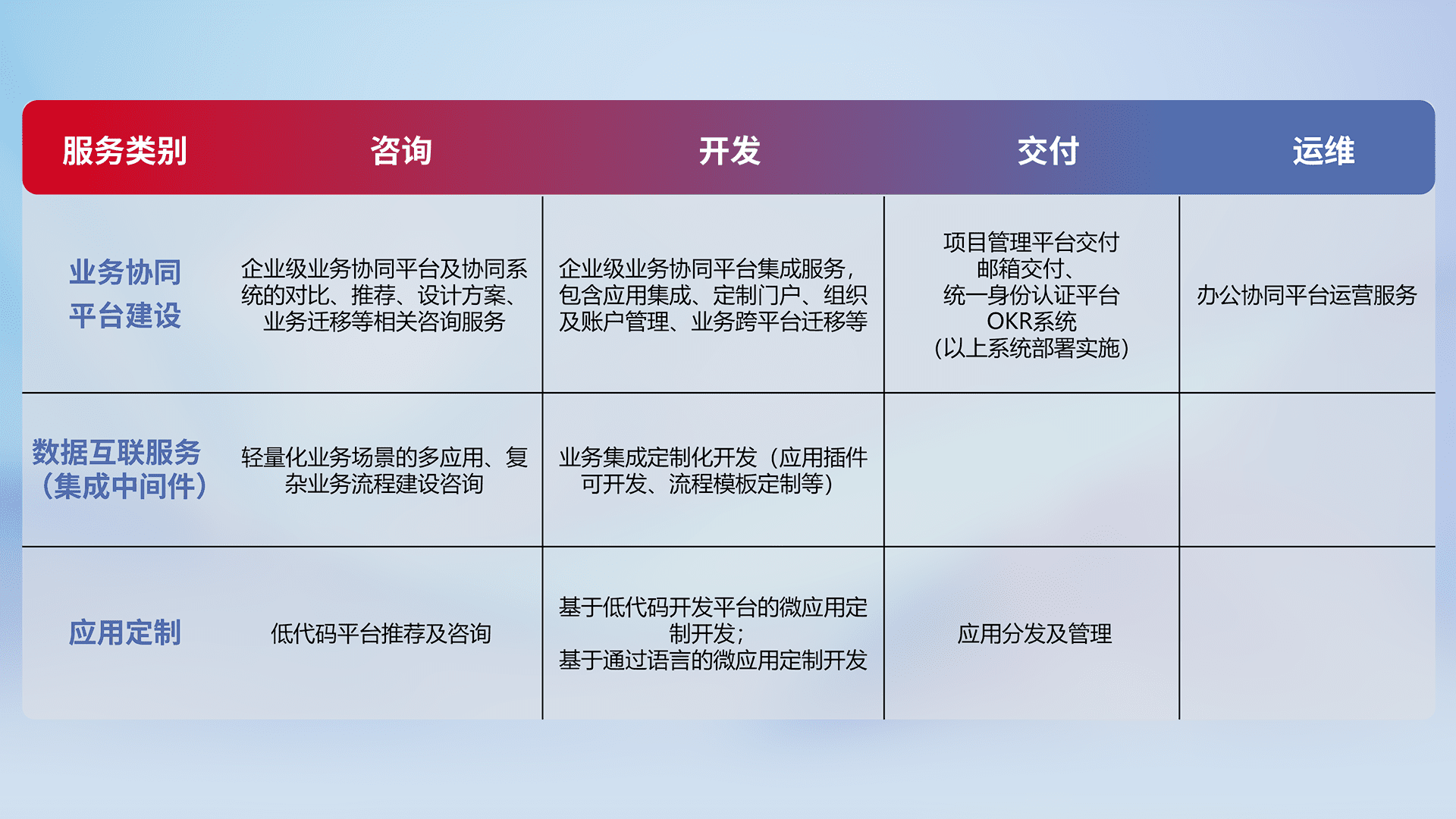 针对钉钉、、、、企微、、、、IDaas等平台级产品提供产品的规划、、方案、、交付、、、定制化开发等服务,,,实现如统一协同办公、、、、智能客户服务、、、混合会议管理、、、智能数据查询、、、、等业务场景,,,,实现数字化转型。。。。